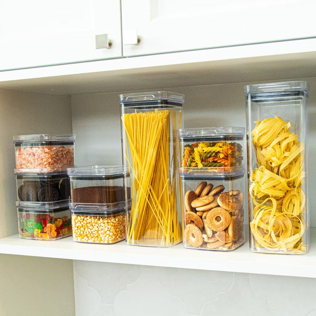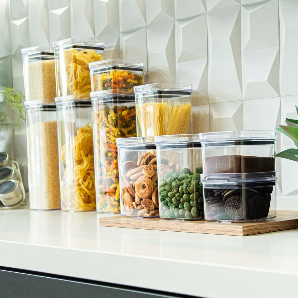 O fechamento hermético ajuda a preservar a qualidade dos alimentos, protegendo contra umidade e odores. Já o design empilhável otimiza o espaço e traz um visual moderno e sofisticado para a cozinha.