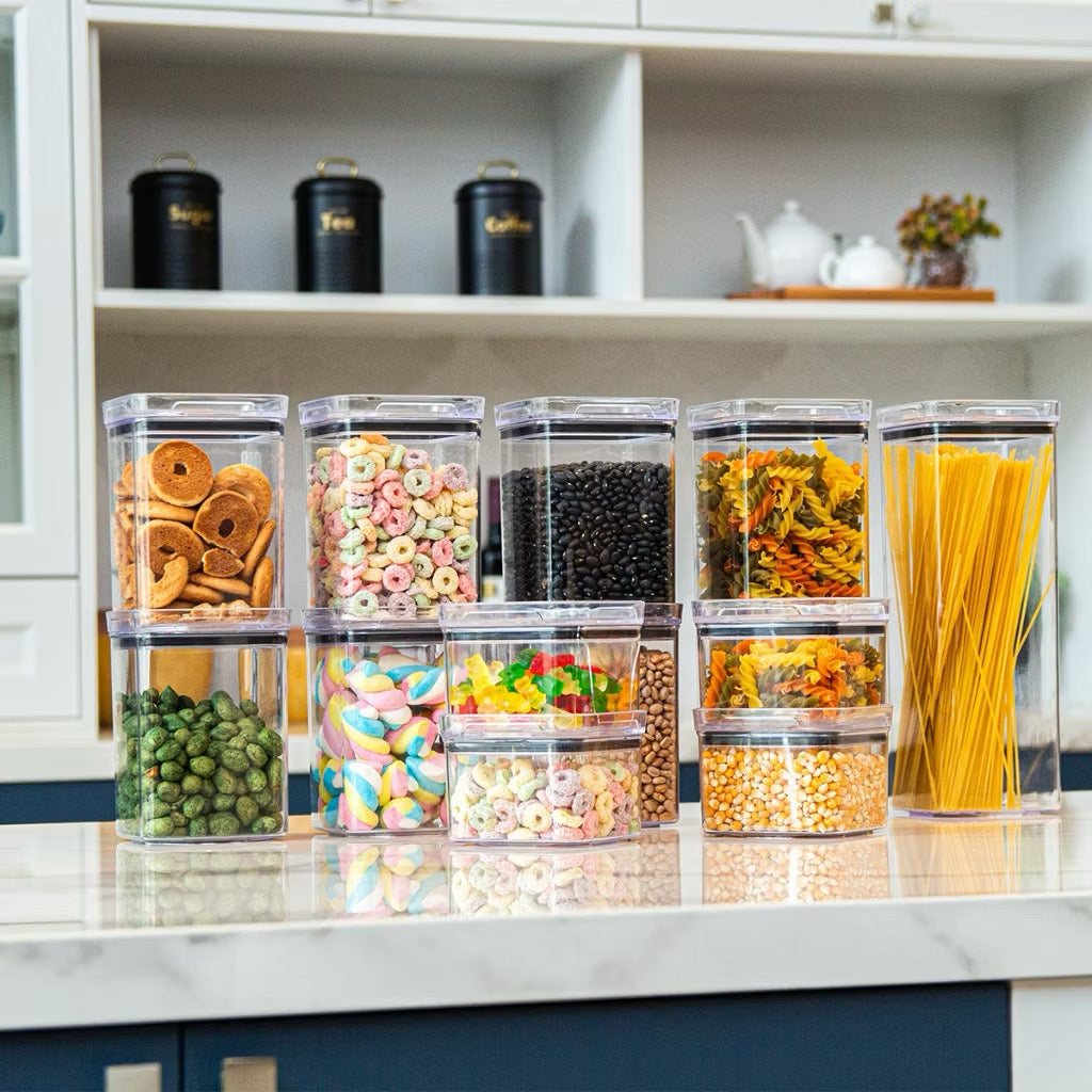 Este kit com 8 potes herméticos é ideal para armazenar mantimentos com mais segurança e conservação. Produzidos em acrílico cristal, permitem visualizar o conteúdo com facilidade, mantendo a despensa e os armários sempre organizados.