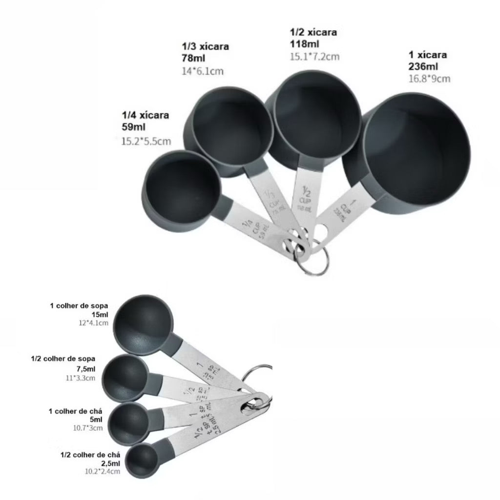 Este kit com 8 peças é ideal para medir ingredientes com exatidão, ajudando você a acertar o ponto das receitas com muito mais facilidade. Perfeito para uso em receitas doces e salgadas, no preparo diário ou em ocasiões especiais.